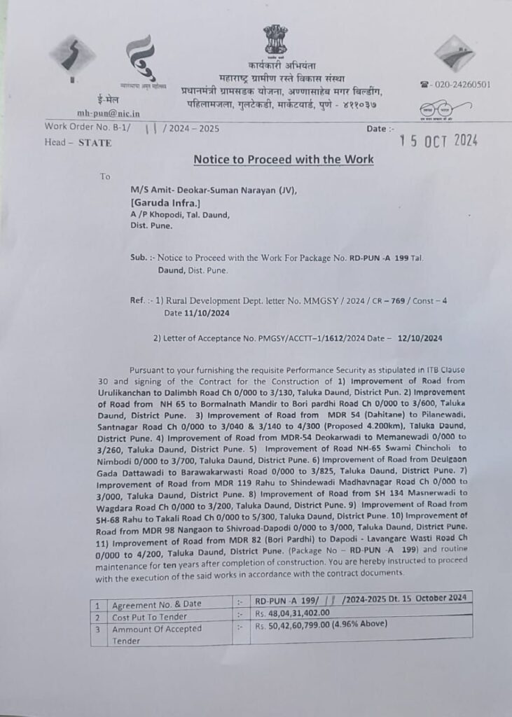 या रस्त्याचे काम हाती घेतले आहे — M/S अमित-देोकर-सुमन नारायण (JV) [गरुडा इन्फ्रा] यांच्याकडे! आश्चर्य म्हणजे याच नावाच्या ठेकेदाराने अलीकडेच दौंड तालुक्यातील अनेक कामांचे ठेके मिळवले आहेत, आणि त्याबाबत आधीच चर्चा तापलेली आहे. पॅकेज क्रमांक RD-PUN-A199 अंतर्गत हा रस्ता मंजूर असून, करार दिनांक १५ ऑक्टोबर २०२४ नुसार १० वर्षांची देखभाल जबाबदारीही याच ठेकेदारावर सोपवली आहे.