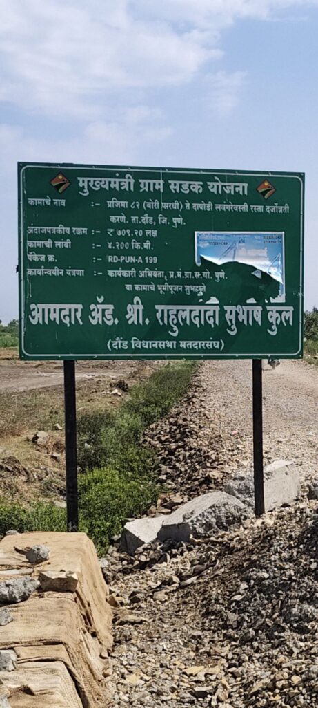 मुख्य अभियंता (PMGSY), MRRDA पुणे यांच्या आदेशानुसार पॅकेज RD-PUN-A198 आणि RD-PUN-A199 अंतर्गत तालुक्यातील तब्बल ११ रस्त्यांची कामे मंजूर आहेत. याच पॅकेजमध्ये बोरी पारधी–दापोडी रस्ता समाविष्ट असून, या सर्व कामांची एकत्रित किंमत ₹50,42,60,799 इतकी आहे — म्हणजेच ४.९६% जास्त किंमतीत करार मंजूर! मग फलकावरील रक्कम वेगळी का? आणि ती कोणाच्या सांगण्यावर बदलली गेली?