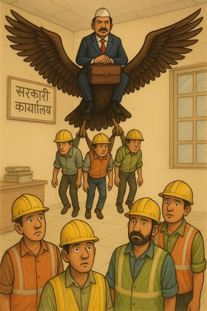 तालुक्यातील १८७ ठेकेदारांनी दबक्या आवाजात “गरुडाच्या टेंडरसाठी नियम पायदळी तुडवले गेले” असा आरोप सुरू केला असून, त्यांच्या गप्प आवाजातून भीतीची सावली स्पष्ट दिसते. “गरुडाच्या विरोधात गेल्यास मोठी किंमत मोजावी लागेल” अशी भीती ठेकेदारांमध्ये पसरली आहे. त्यामुळे प्रश्न निर्माण झाला आहे की — गरुडाच्या पाठीशी नेमकं कोणाचं राजकीय संरक्षण आहे?