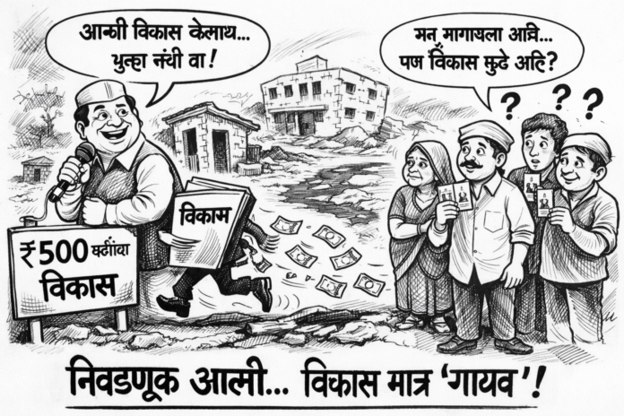 जिल्हा परिषद व पंचायत समितीच्या निवडणुका तोंडावर असताना ‘विकास’चा टाहो फोडणाऱ्या राजकीय मंडळींना एकच थेट प्रश्न विचारला गेला पाहिजे—मागील निधीतून प्रत्यक्षात काय झाले? कागदांवरील विकास आणि जमिनीवरील वास्तव यातील दरी कोण जबाबदारीने भरून काढणार?