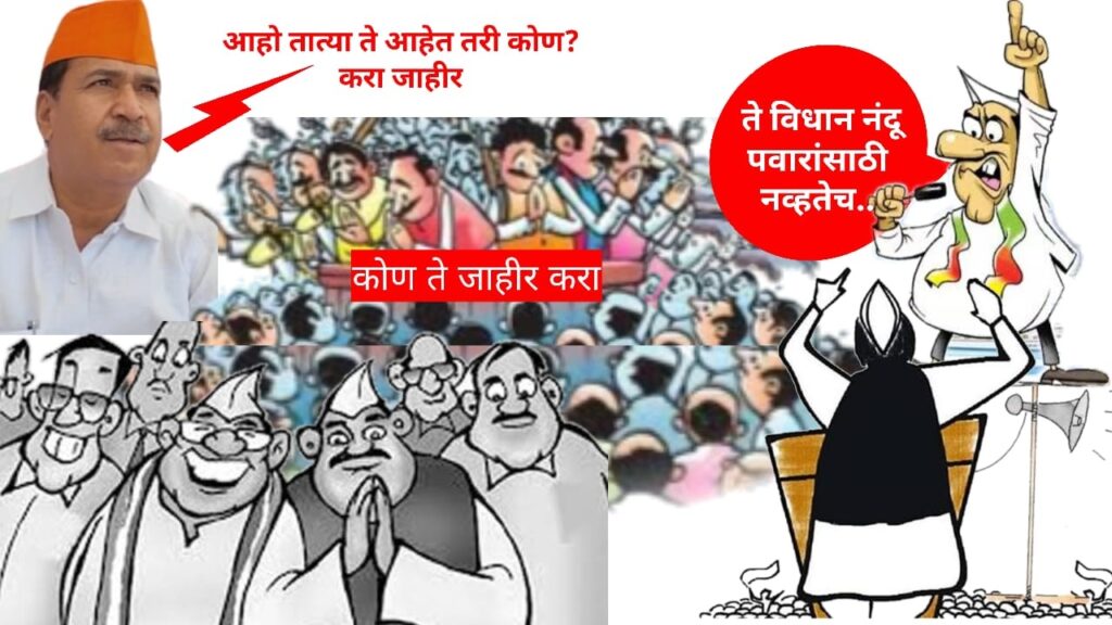 साळुंखे म्हणाले,तात्या तुम्ही नंदू पवारांचा आदर केला आम्ही तुमचा आदर करतो मात्र नेत्यांनी जाहीर भाषणातून सिजनबेल पुढाऱ्यांचा नामो उल्लेख केलेला आहे या सर्व नेत्यांची माहिती आपणच मतदारांपर्यंत पोहोचवली पाहिजे त्याचवेळी मतदारांमध्ये या सिजनिबल पुढऱ्या बद्दल क्रोध मत्सर व द्वेष निर्माण होईल आणि त्याचा फायदा आपल्या नेत्याच्या मतदानासाठी होईल म्हणूनच आता ही नावे जाहीर करणे ही काळाची गरज आहे तुम्ही एकदा त्याच्यावर शिक्का मोर्तब कराच आणि ही नावे जाहीर करा अशा स्वरूपाचं माझ ठाम मत आहे..