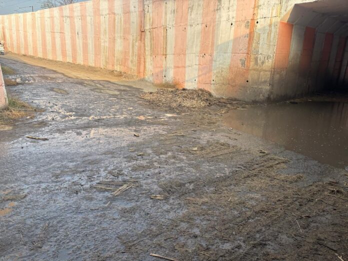 रेल्वे पुलाखाली पाणी व ऊसाचा कचरा साठल्याने वाहतुकीस अडथळा